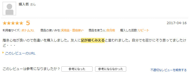 レビュー通りでしたし、グレーのカモフラはホントに足が細く見えました!教えてくださった方に感謝です。