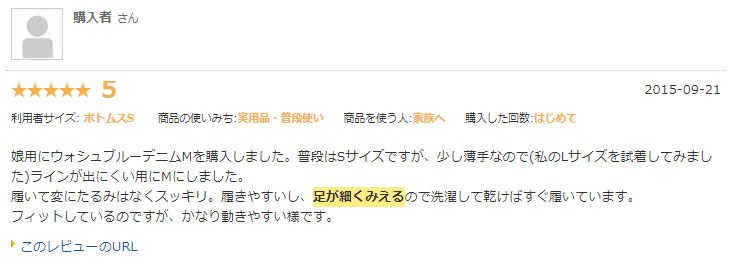 足が細くて長く見えるようです。洗濯してもきれいに乾きます。ウエストの紐が少し伸びるタイプの紐だとはきやすいかな。太ももが細身なので今度はLサイズも買ってみたいと思います。