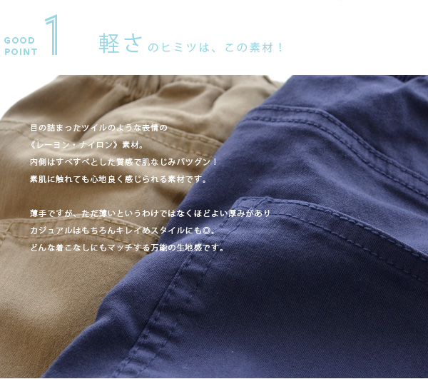 ウエストがゴムなので、トップにダボッとしたものを着てウエストを隠すと(笑)足が細く見えました。